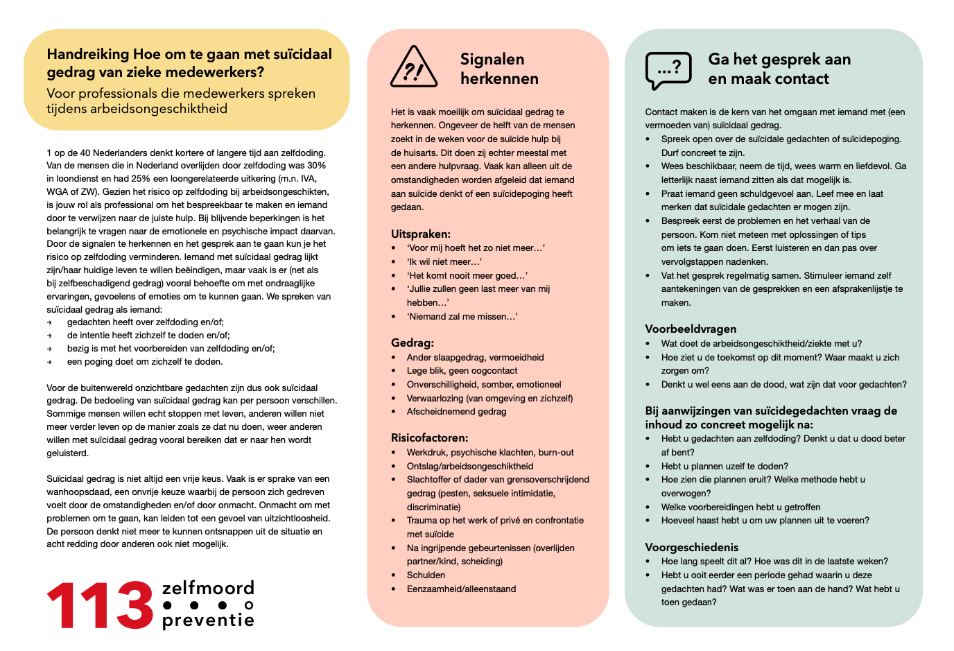 De handreiking ‘Als ik kan zeggen wat ik denk’ geeft mensen werkzaam in het onderwijs handvatten om beter om te gaan met suïcidaliteit bij leerlingen. Bijvoorbeeld over hoe je een gesprek over zelfmoordgedachten en – plannen voert, welke hulpverlening je in kunt schakelen en hoe je een suïcidepreventie-protocol opstelt.